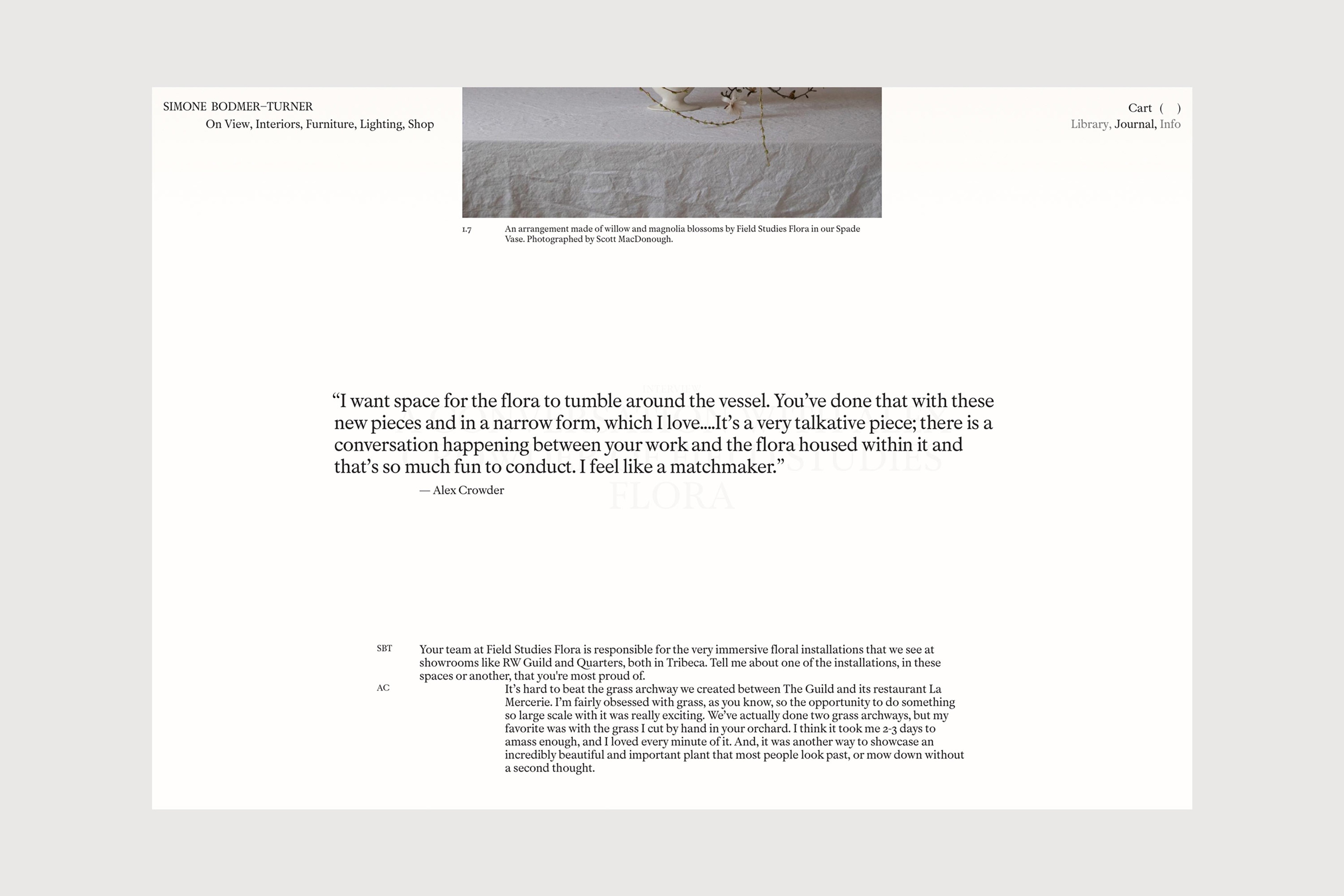 Artist Simone Bodmer-Turner invited us to develop a new brand language and portfolio oriented e-commerce site to house her evolving collection. Balancing the dual imperatives of artistic practice and studio, the website houses her collected works alongside past exhibitions, archives, studio library and journal—establishing a new immersive portal into the world of SB-T.